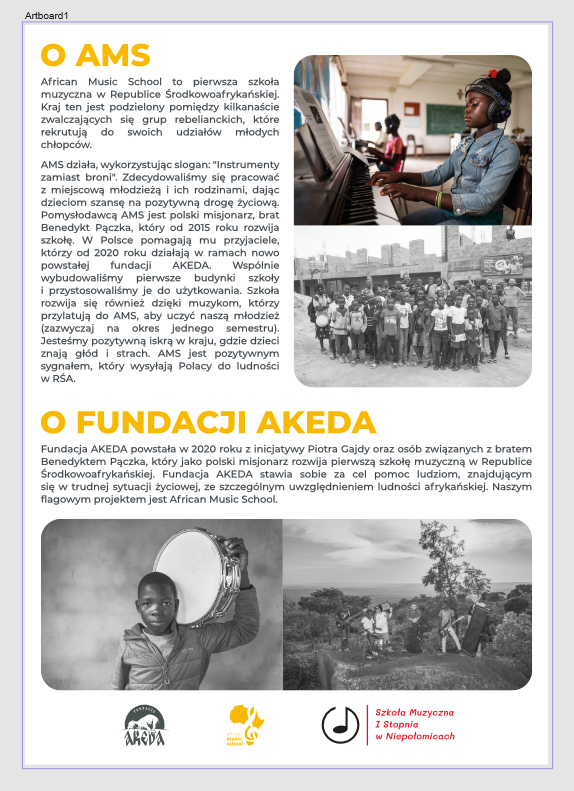 Dodatkowo podczas wydarzenia będzie można wesprzeć African Music School czyli pierwszą w Afryce Szkołę Muzyczną. Hasło przewodnie organizatorów to "instrument zamiast broni", dając jednocześnie ogromną szansę wszystkim dzieciom na normalne, dobre życie.